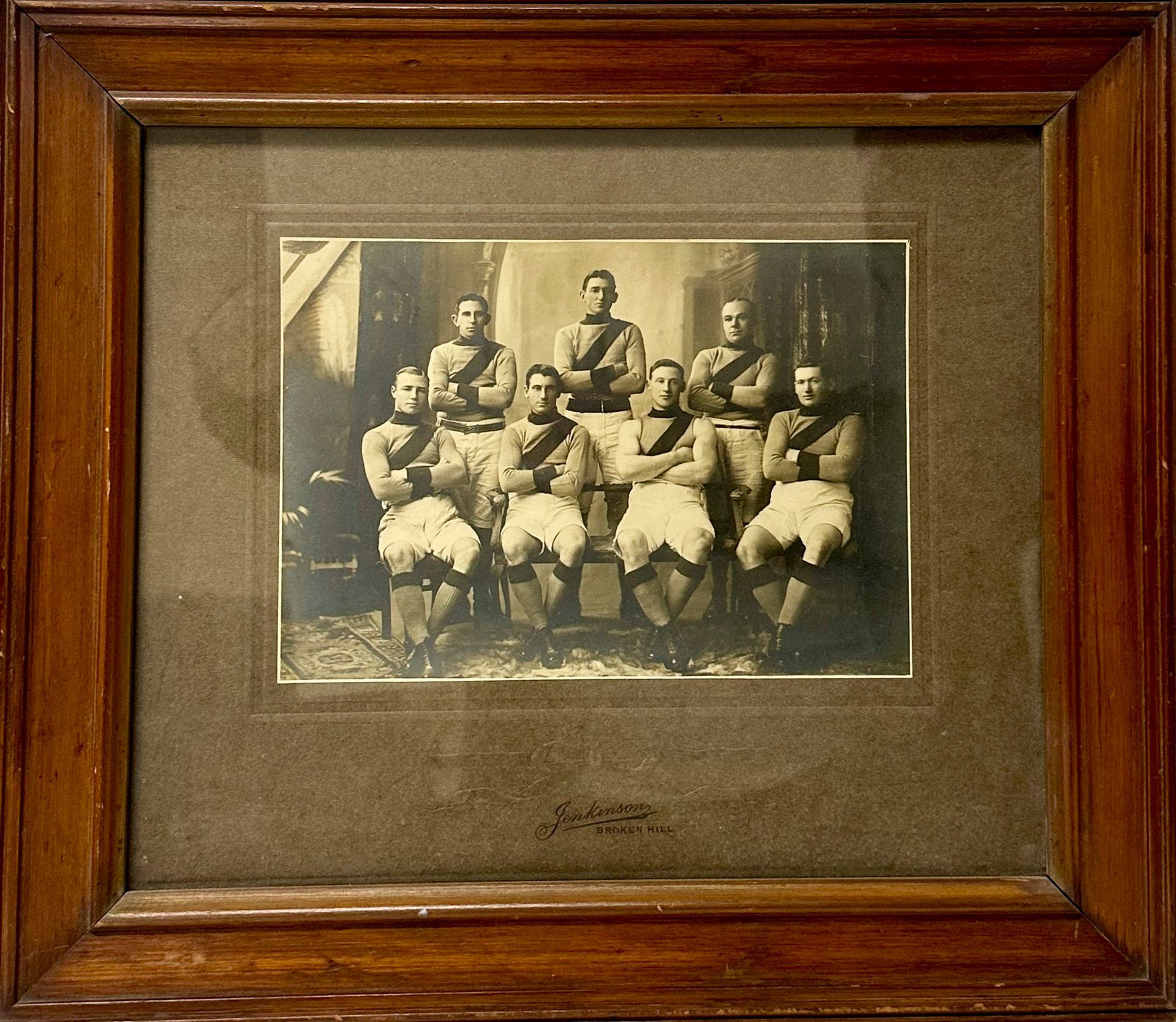 The club’s colours were dark blue knickerbockers, guernsey and hose, and a blue cap with a white stripe down the centre.